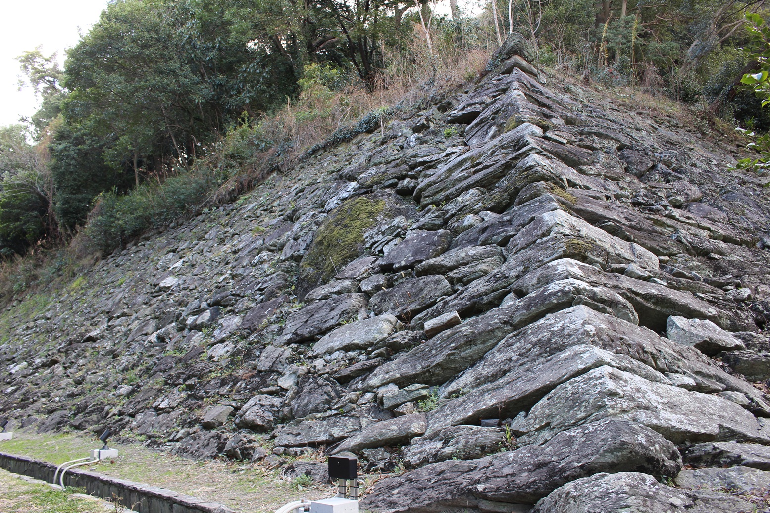 砂の丸(北側)近くの「鶴の渓」周辺の石垣も豊臣・桑山期に積まれたものと考えられています。天守台石垣と比べると大ぶりな結晶片岩を用いた野面積み石垣です。