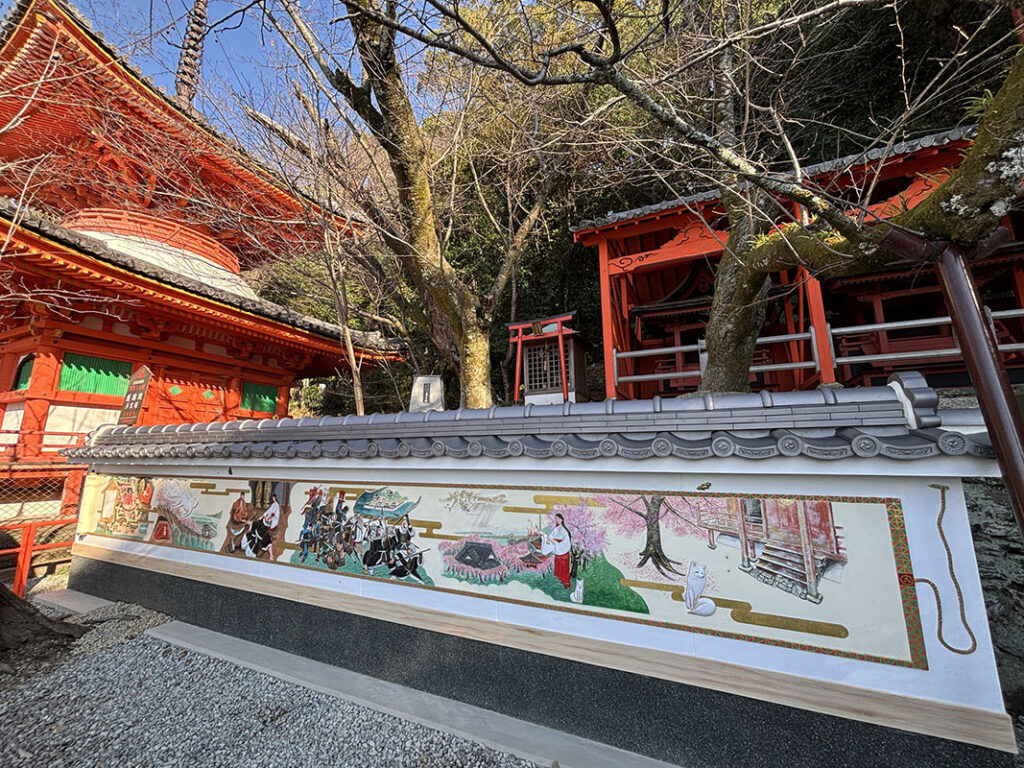 境内から朱色の鳥居を上がった所にある三社壇現の隣には春子稲荷が祀られており、伝承をモチーフとした「伝説壁画」も描かれています。壁画には豊臣の軍勢と戦う様子や、春子の姿が美しい色彩で表現されています。