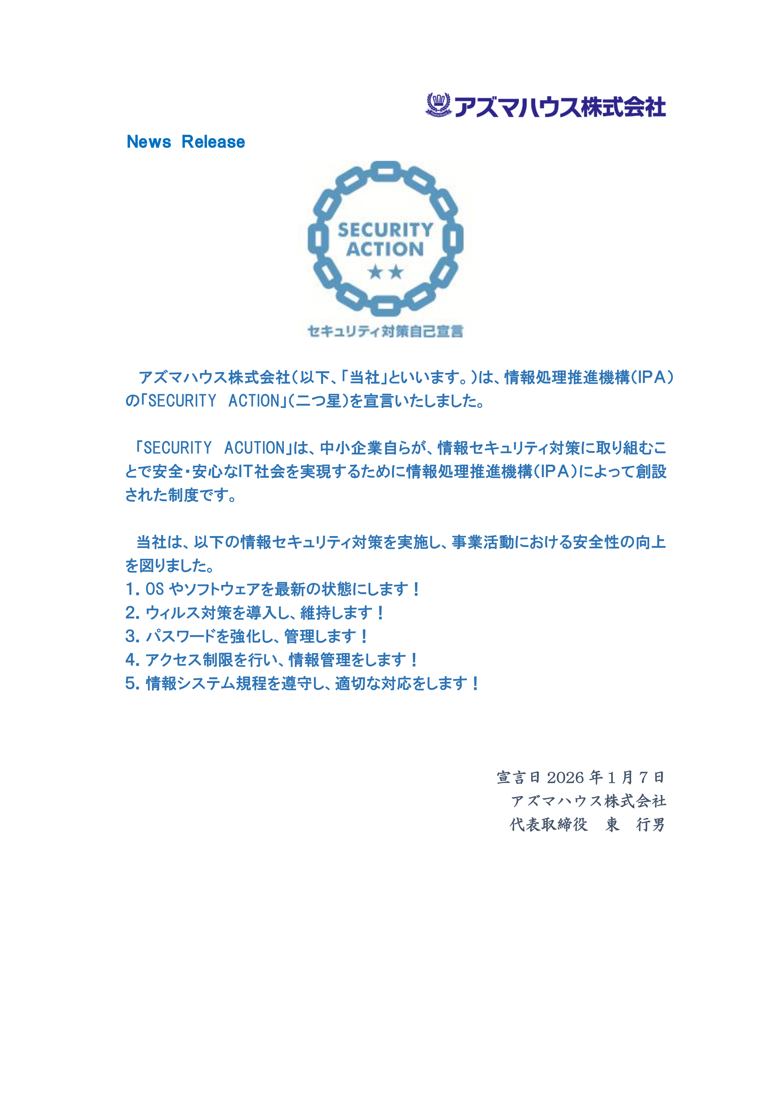 SECURITY ACTION(二つ星)を宣言しました。 公開日2026年1月7日 お知らせ SECURITY ACTION(セキュリティ対策自己宣言) https://www.ipa.go.jp/security/security-action/index.html