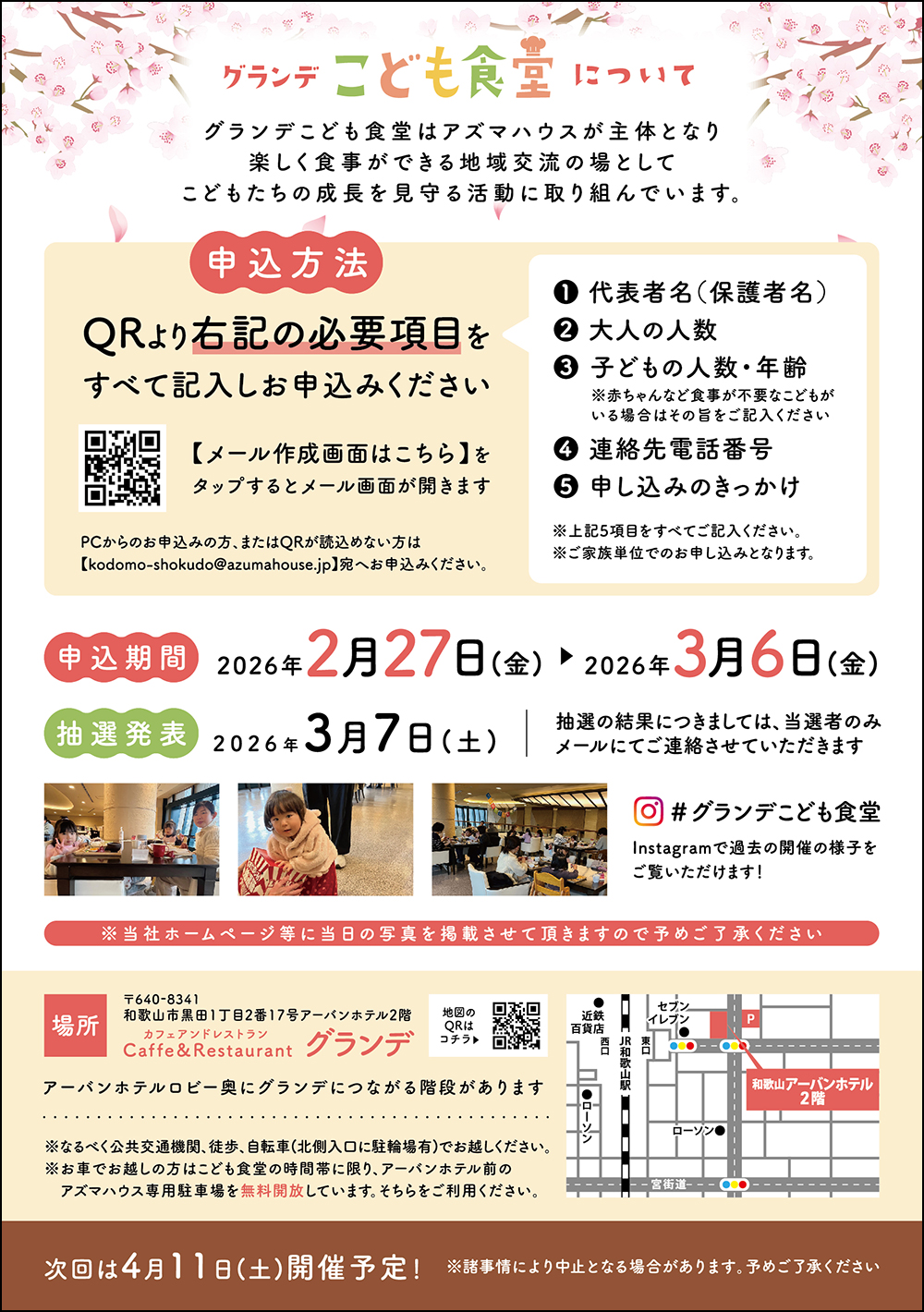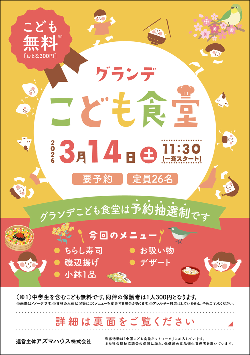 グランデ子ども食堂開催のお知らせ 3月14日(土)11:30 ~ 13:00 公開日2026年2月26日 お知らせ 2/27(金)より受付を開始致します。 受付締切日:3/6(金)(メール受付のみとなります) ※抽選方式です。 完全予約制 / 定員:26名