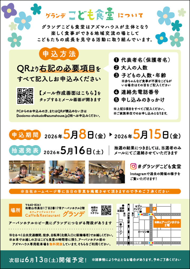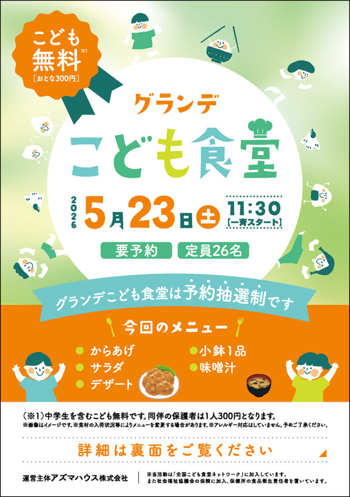 グランデ子ども食堂開催のお知らせ5月23日(土)11:30 ~ 13:00 公開日2026年4月23日 お知らせ 5/8(金)より受付を開始致します。 受付締切日:5/15(金)(メール受付のみとなります) ※抽選方式です。 完全予約制 / 定員:26名