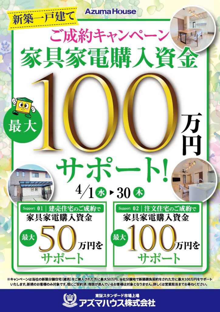 新築一戸建てご成約キャンペーン 「家具家電購入資金 最大100万円サポート!」2026年4月1日~2026年4月30日まで